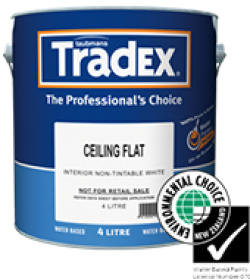 A flat interior finish, without side sheen for use on ceilings where glancing or critical lighting can highlight surface imperfections. Taubmans Tradex Ceiling Paint is a multi-purpose flat paint ideal for use on ceilings. Specifically formulated for application by roller. Tradex Ceiling Paint has excellent opacity and dries to a uniform flat, white finish.